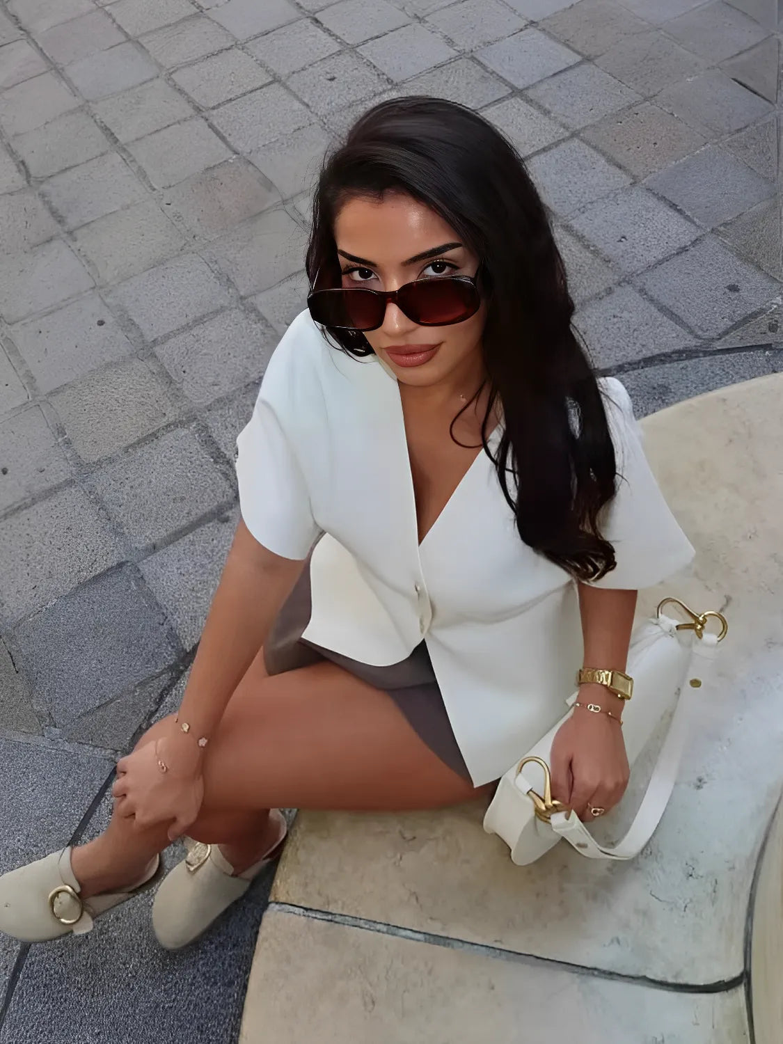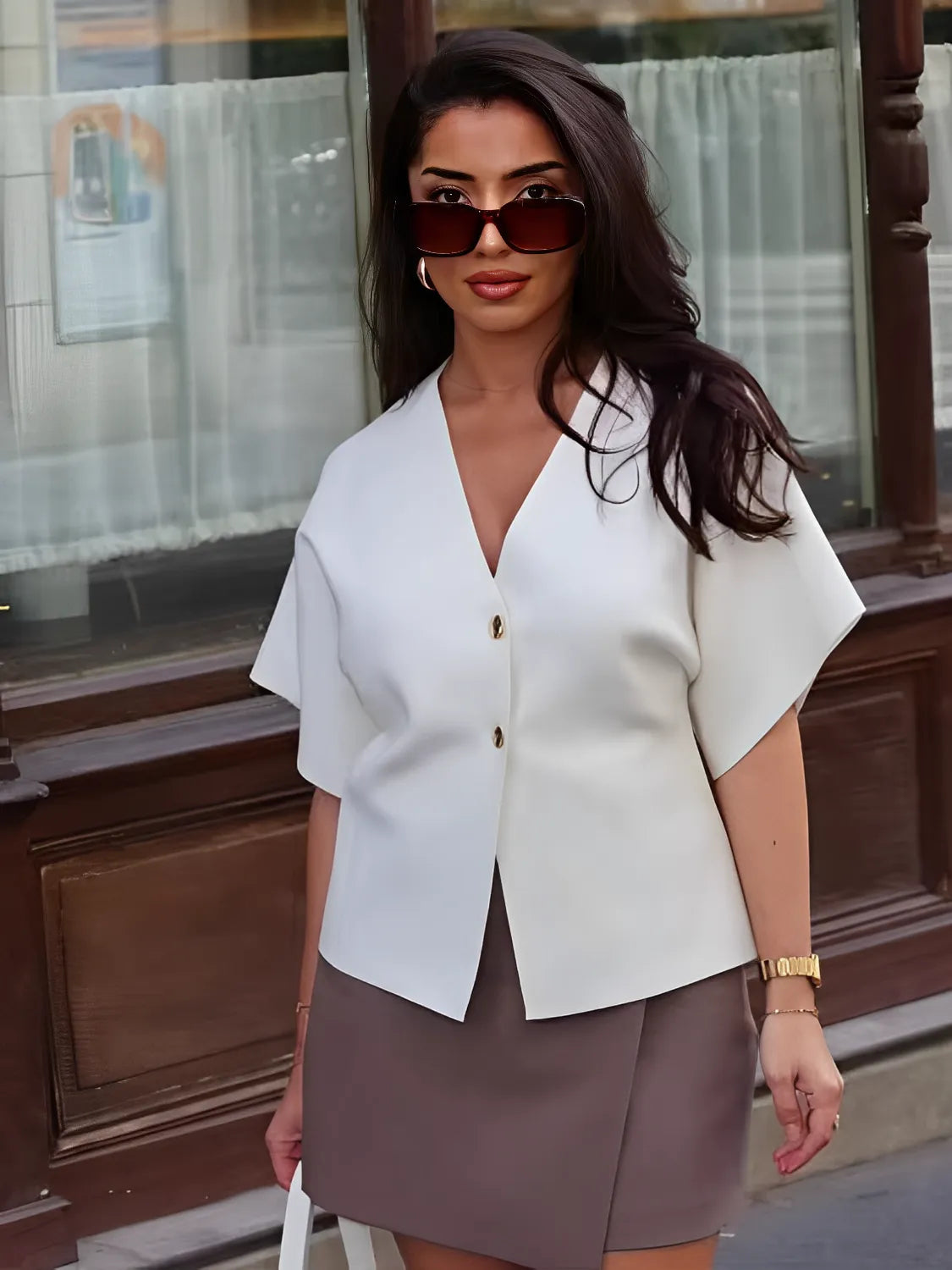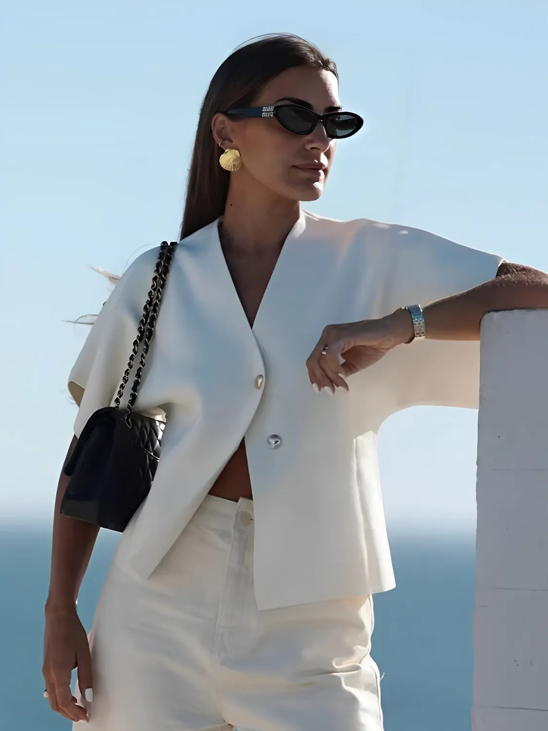 A Blusa Hera é uma celebração ao estilo clássico da Grécia antiga, trazendo uma sofisticação que ecoa os tempos de deuses e deusas, agora reinterpretada para os dias modernos. Imagine-se caminhando por colinas ensolaradas, com o vento tocando sua pele suavemente enquanto veste essa peça que combina elegância e simplicidade. Com sua abertura frontal e abotoamento delicado, a Blusa Hera transforma qualquer look em uma obra de arte atemporal. A gola em V e as mangas curtas completam essa peça perfeita para os dias quentes de primavera e verão, criando um visual chique e refinado.
