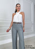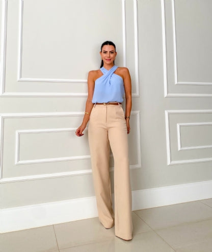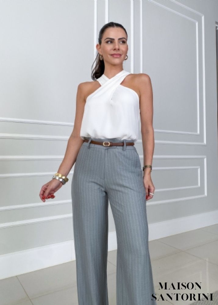 - Detalhe Calça: Modelo pantalona com bolsos faca, fechamento frontal em botão e bolsos fake traseiros. Possui passadores e forro.
