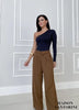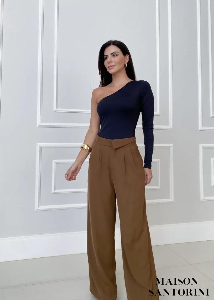 - Calça modelo pantalona com detalhe em dobradura unilateral no cós, bolsos faca, drapeados na parte superior e fechamento em zíper frontal