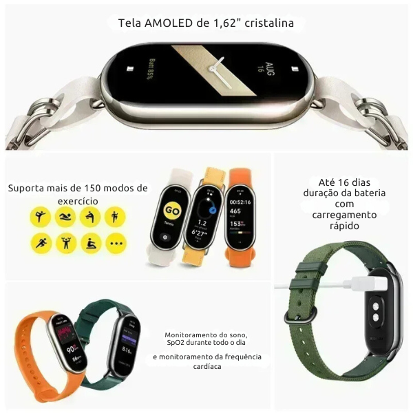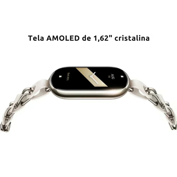 *A Xiaomi Smart Band 8 apresenta um design de tela em formato de pílula que fica dentro de um