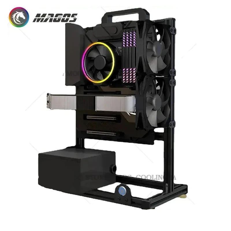 Gabinete aberto com fácil instalação de peças, com um design inovador para você montar a sua máquina aonde quiser, com o design aberto melhorando ainda mais o desempenho de resfriamento do PC