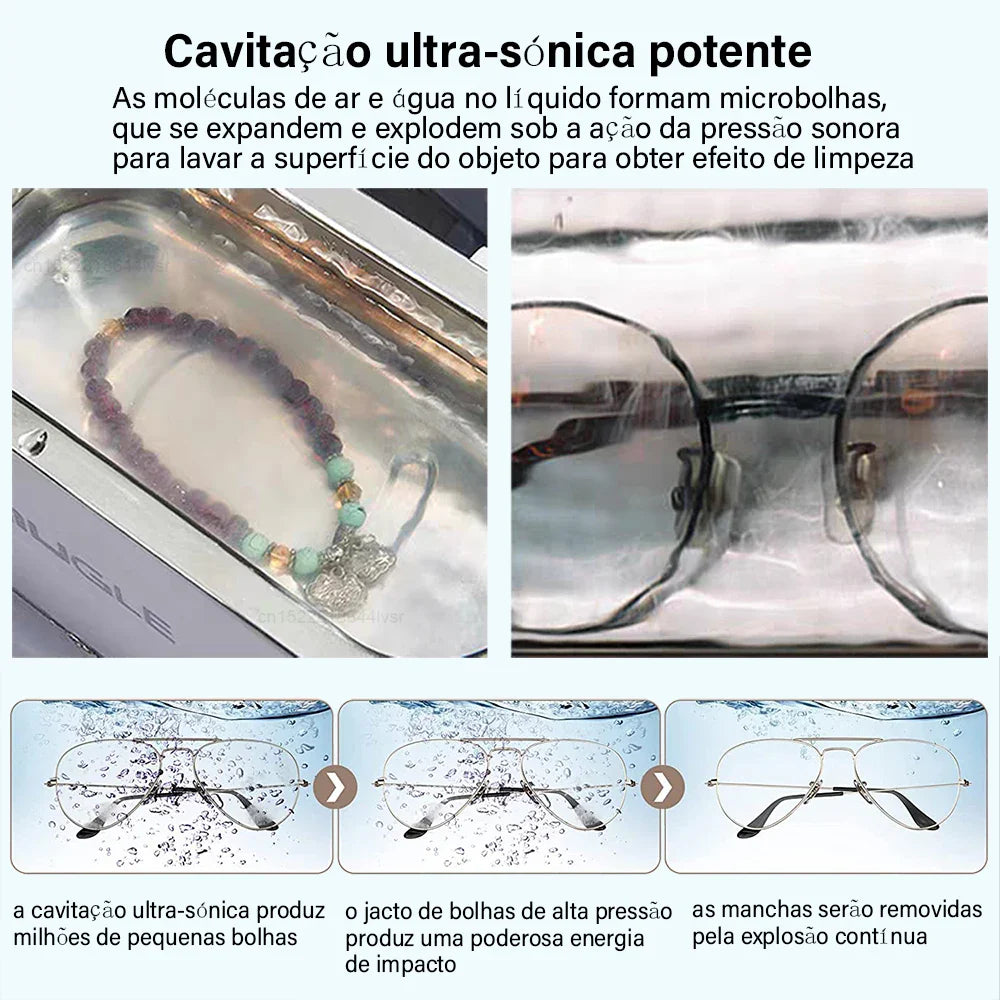 Tecnologia ultrassônica avançada: Nosso limpador ultrassônico opera a uma frequência de 46.000 Hz, 35W. Aproveitando o poder da cavitação, remove eficazmente a sujidade superficial dos itens sem danificá-los.
