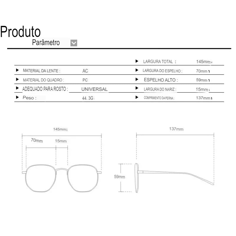 Proteção UV Completa: Nossas lentes de alta qualidade garantem proteção UV400, bloqueando 100% dos raios UVA e UVB, preservando sua visão em qualquer ambiente.