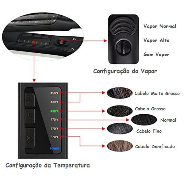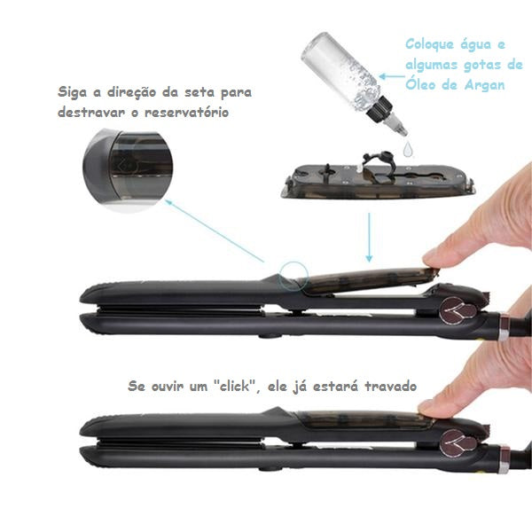 O vapor condiciona os fios deixando-os leves e sedosos. As placas de Titânio e Turmalina alisam com perfeição deixando os seus cabelos super alinhados. Possui o incrível reservatório para utilização de Água com gotas de Óleo de Argan, que são convertidos em vapor, hidratando e deixando suas madeixas extremamente macias durante o processo de alisamento.